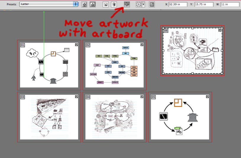 The other day I was working on multiple conceptual diagrams in Illustrator which were all related to each other, when the light bulb turned on. As I copied a design element from one window and switched over to another I realized this might be the perfect time to play with the multiple artboards feature.