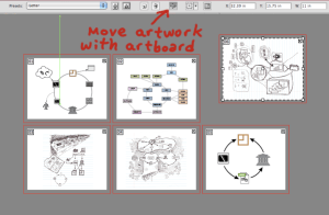 I imagine using one file with multiple artboards would have a great potential for project file management. Instead of having a folder full of various files I’m envisioning one file with all the separate diagrams & pages included inside it, as separate artboards. Any of the artboards could be updated and the whole file saved, which might make it easier (at least for me) to keep track of the newest versions of each separate file. I’m not finding any simple way within Illustrator to re-order the artboards, you can move them into different locations but they retain the auto-generated artboard number. I’ve discovered that you can create a new artboard and drag the artwork from a previous artboard to the new one and then delete the old artboard. When you do this the artboards are re-numbered.