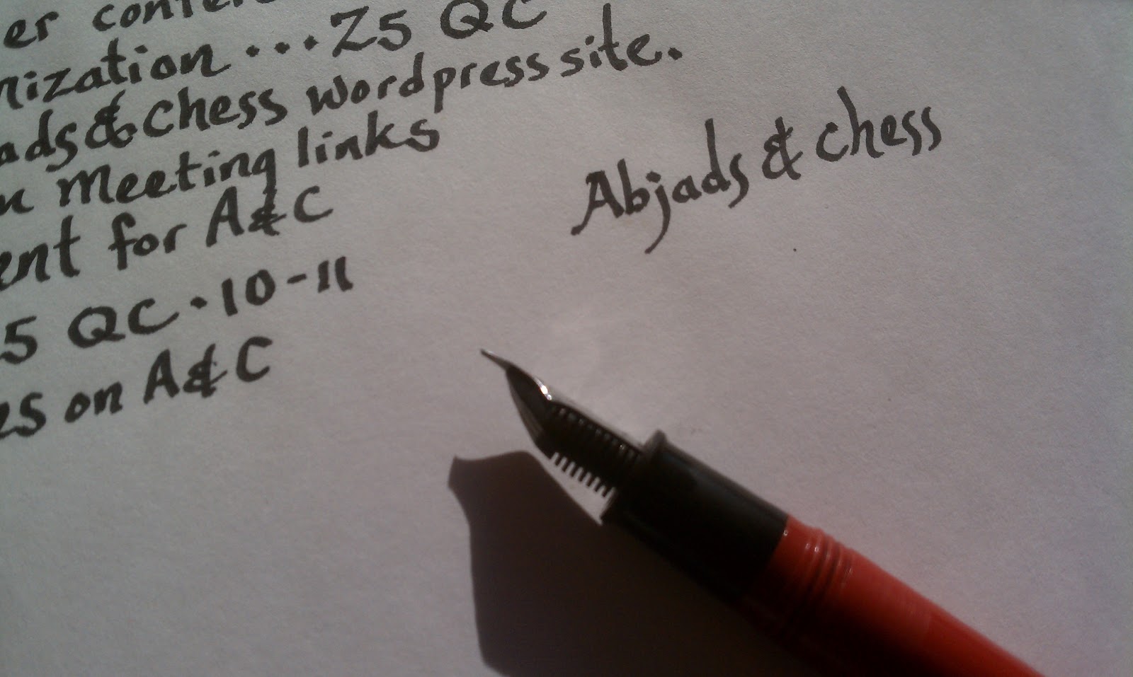 ink & paper, abjads & chess September 26, 2012April 9, 2019 ~ John Trendler Share this: Click to share on X (Opens in new window) X Click to share on Facebook (Opens in new window) Facebook Click to share on LinkedIn (Opens in new window) LinkedIn Like Loading...