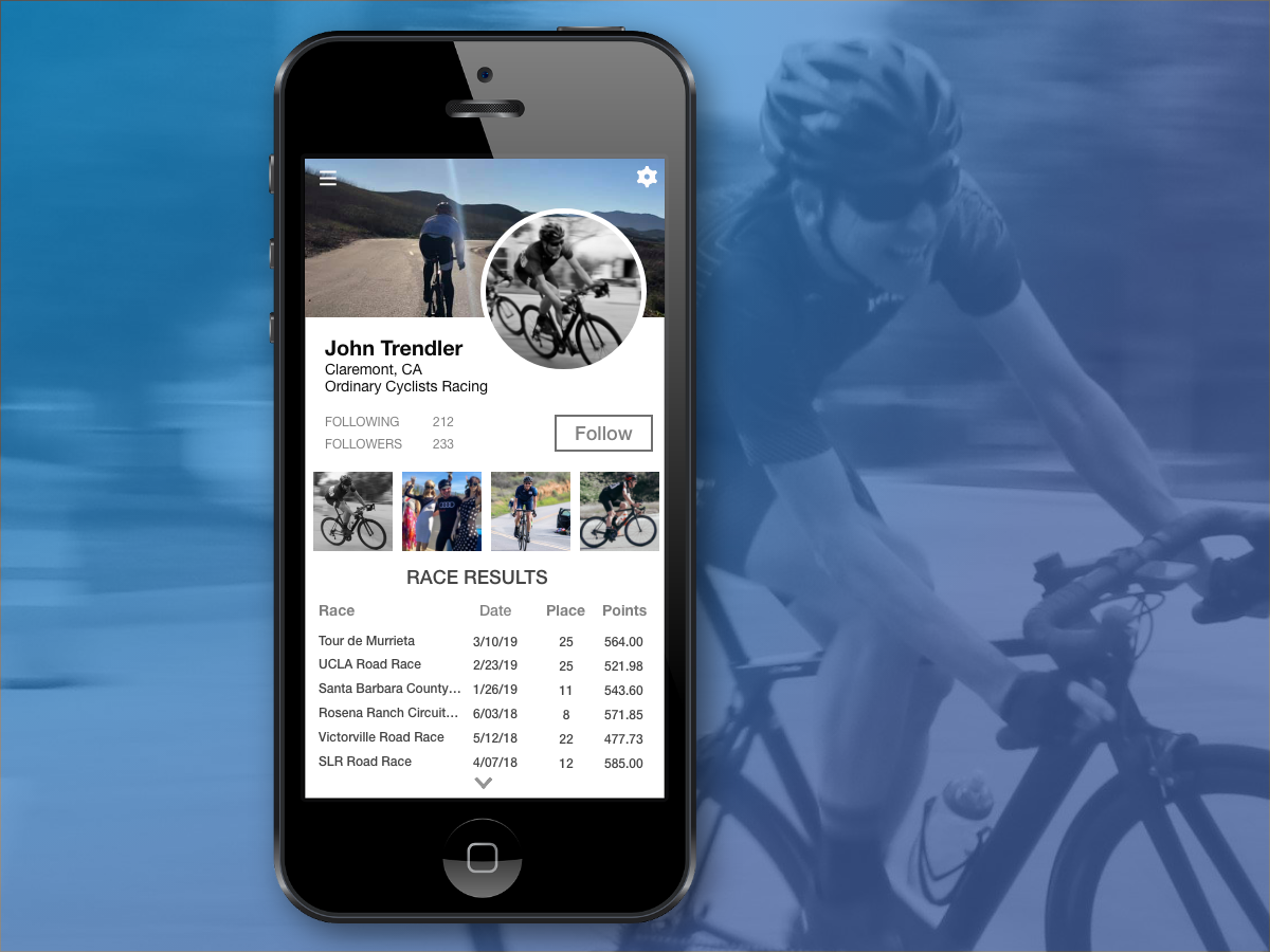 Day 006’s challenge was to create a User Profile. I decided to use my cycling as inspiration and come up with a profile for a cyclist’s racing info. USA Cycling has a mobile app that leaves plenty to be desired, and I use Road Results to check info too but they don’t have a mobile experience. So I worked on an updated user interface.